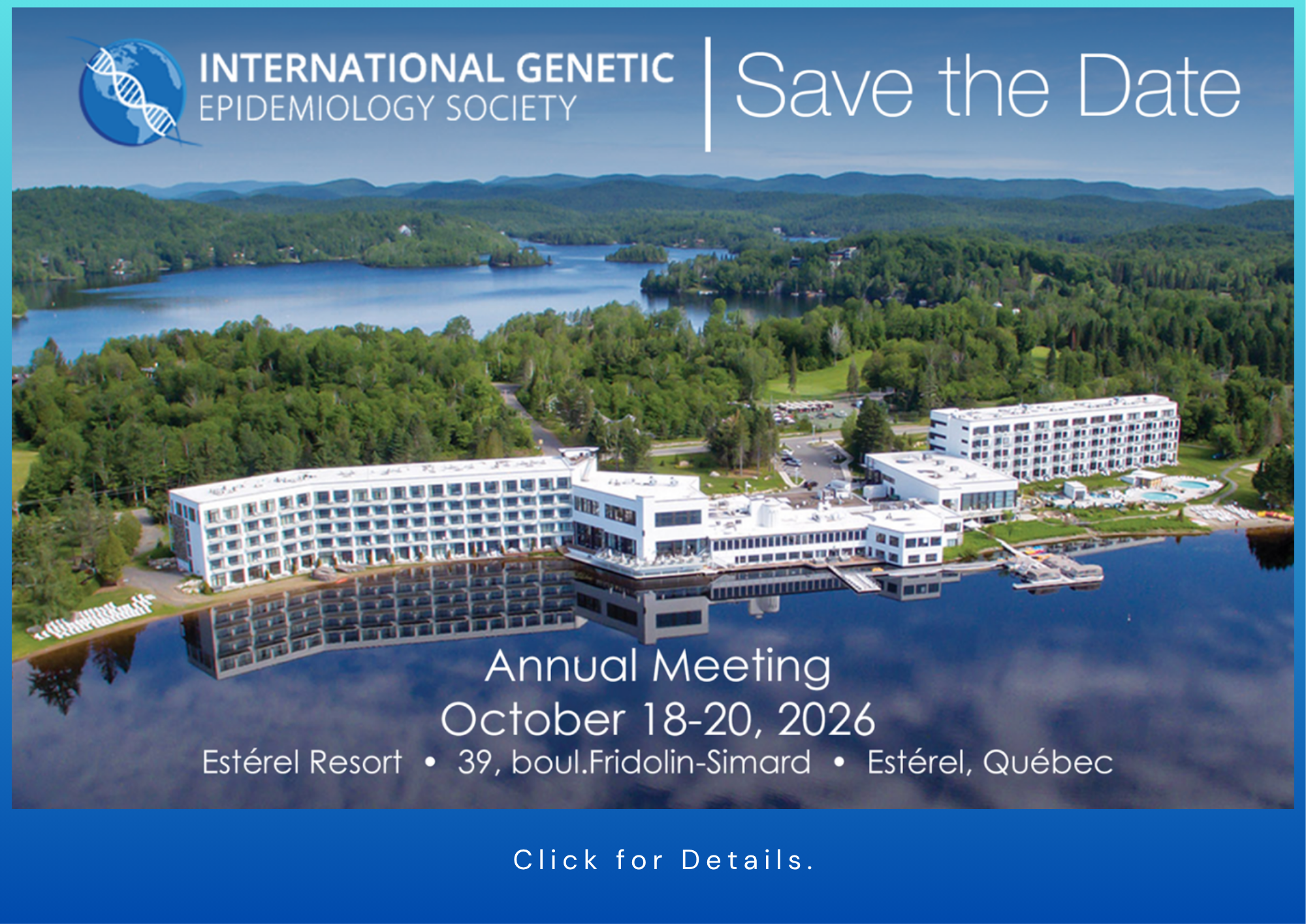 We invite you to the 2026 IGES Annual Meeting and Education Workshop, taking place at the incredible Estérel Resort near Montréal. Our Annual Meeting is the premier gathering for experts in genetic epidemiology and statistical genetics! Join us as we bring together experts and emerging leaders in genetic epidemiology, a field at the intersection of genetics and epidemiology, focused on understanding the interplay between genes and the environment in shaping complex traits and diseases. We will explore groundbreaking research, innovative methodologies, and collaborative opportunities within the field as we offer